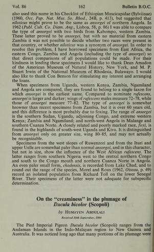 Published in Bulletin of The British Ornithologists' Club, in 1966, in volume 86, pages 162-163