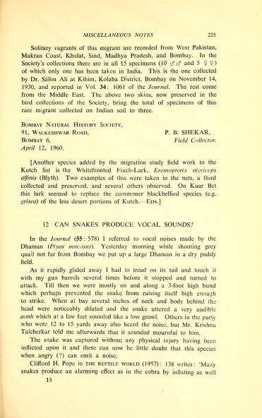 Published in Journal of The Bombay Natural History Society, in 1960, in volume 57, pages 225-226