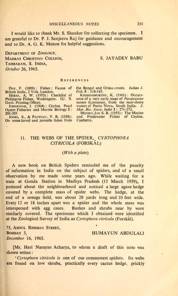 Published in Journal of The Bombay Natural History Society, in 1966, in volume 63, pages 211-212