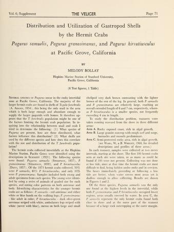 Distribution and utilization of gastropods shells by the hermit crabs Pagurus samuelis, P. granosimanus, and P. hirsutiusculus at Pacific Grove, CalifPublished in Veliger, in 1964, in volume 6, pages 71-76Created: 2013-08-04, modified: 2013-08-04Factors Contributing to Platypus Mortality in VictoriaPublished in Victorian Naturalist, in 2010, in volume 127, issue 5, pages 178-183Created: 2017-10-12, modified: 2017-10-12