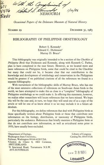 Published in Bulletin of The British Ornithologists' Club, in 1982, in volume 102, pages 39-40