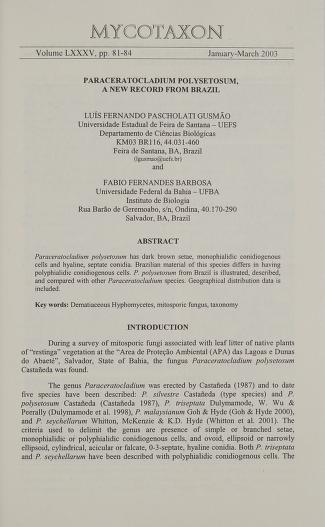 Published in Mycotaxon, in 2003, in volume 85, pages 81-84
