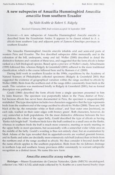 Published in Bulletin of the British Ornithologists' Club, in 2010, in volume 130, issue 1, pages 3-7