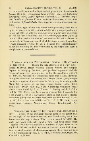 Published in Entomologist's Record and Journal of Variation, in 1986, in volume 98, issue 1-2, pages 30
