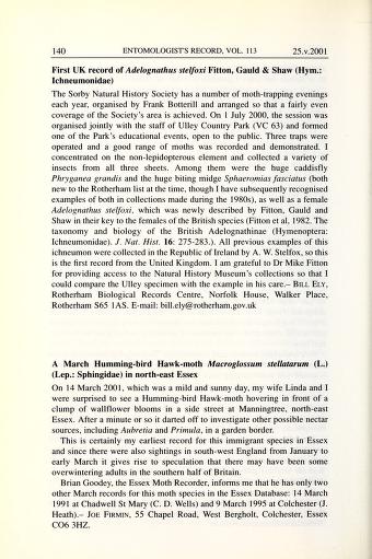 Published in Entomologist's Record and Journal of Variation, in 2001, in volume 113, issue 3, pages 140