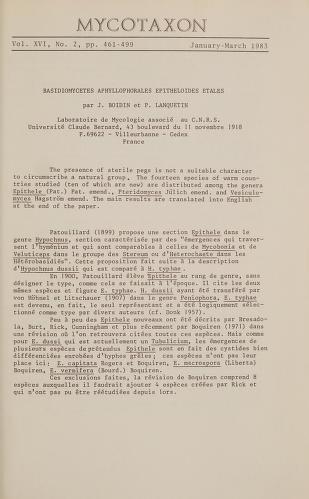Published in Mycotaxon, in 1983, in volume 16, issue 2, pages 461-499