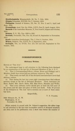 Published in The Auk, in 1915, in volume 32, pages 133-134