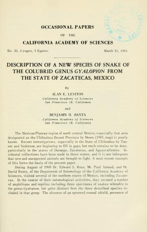 Published in Occasional Papers of the California Academy of Sciences, in 1961, in volume 26, pages 1-4
